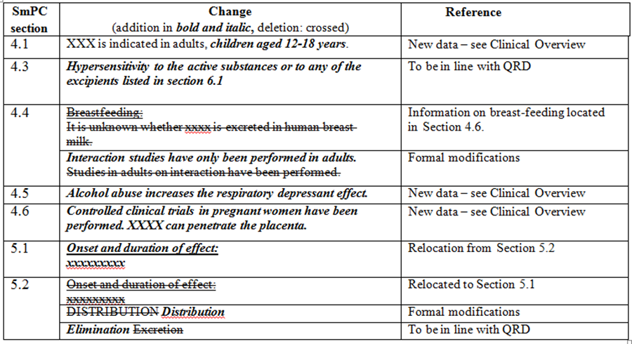 | Sections 4.1 + 4.2 + 5 | Addition of a new indication associated with a change in posology | C.6 – a single classification |
