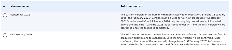 Dále informujeme, že od 25. 11. 2025 je v PLM zpřístupněna nová verze web based eAF 1.2.1.1, která obsahuje nový číselník klasifikace pro žádosti, které budou předloženy od 15. 1. 2026, tj. ode dne platnosti nového klasifikačního pokynu. Tuto verzi žádosti lze zvolit při vyplňování žádosti v PLM v části Form – version pod názvem UAT January 2026.